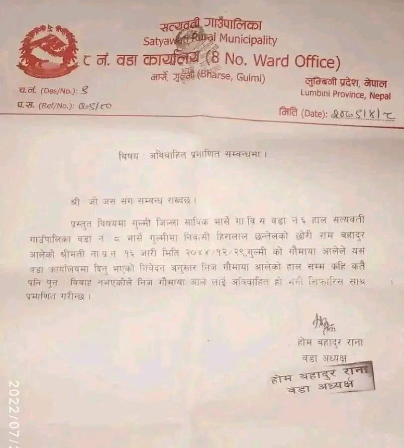 गुल्मी : गुल्मीको सत्यवती गाउँपालिका- ८ का वडा अध्यक्ष होमबहादुर रानाले विवाहित महिलालाई अविवाहित भनेर सिफारिस गरेपछि सामाजिक सञ्जालमा उक्त सिफारिस पत्र भाइरल भएको छ।