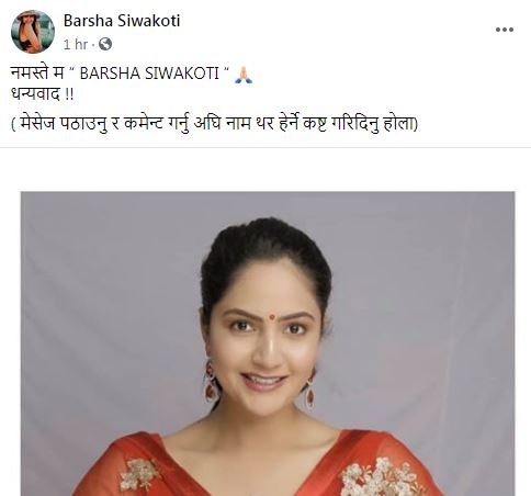 जसले गर्दा वर्षा सिवाकोटीले सामाजिक संजालमा आफ्नो एक फोटो पोष्ट्याउँदै लेखेकी छिन् – नमस्ते म वर्षा सिवाकोटी धन्यवाद । मेसेज पठाउनु र कमेन्ट गर्नु अघि नाम थर हेर्ने कष्ट गरिदिनु होला ।