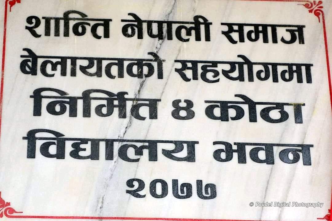 सान्ती नेपाली समाज बेलायतको सहयोगबाट बनेको चारकोठे भवनको उद्घाटन कार्यक्रममा जनप्रतिनिधि, व्यवस्थापन समिती, शिक्षक अभिभावक संघ, सल्लाहकार, भवन निर्माणका सम्पर्ण ब्यक्तिहरुको सम-उपस्थितिमा विद्यार्थीका विभिन्न कार्यक्रम रहेको थियो।