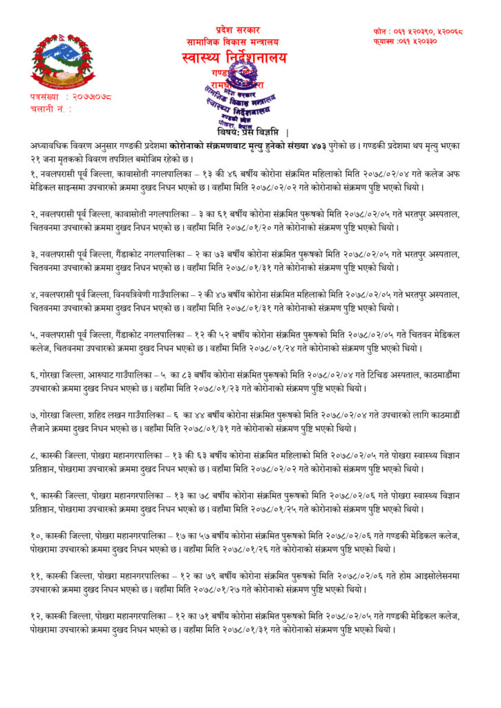यो सँगै गण्डकी प्रदेशमा कोरोना संक्रमणबाट मृत्यु हुनेको संख्या ४ सय ७३ पुगेको छ।