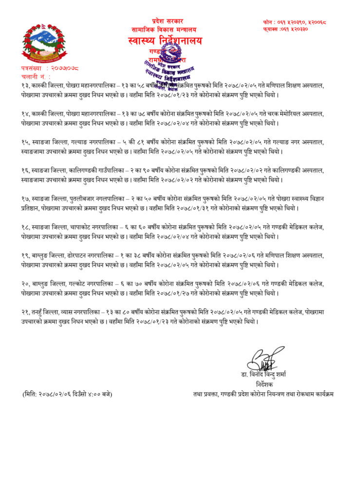 पोखराका विभिन्न अस्पतालहरुमा उपचाररत ११ जना सहित गण्डकी प्रदेशमा २१ जना कोरोना संक्रमितहरुको मृत्यु भएको स्वास्थ्य निर्देशनालय गण्डकी प्रदेशले जनाएको।